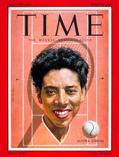 К началу осени 1957-го Гибсон стала первой черной женщиной на обложках Time и Sports Illustrated, а чуть позже – первой черной женщиной, признанной Associated Press спортсменкой года, хотя еще тем летом на грунтовом чемпионате США в Чикаго ее отказывались селить в гостиницу, а местный ресторан не бронировал столы под прием в ее честь. Гибсон абстрагировалась от происходящего профессиональным эгоизмом: «Я пробовала быть послом афроамериканцев, но это оказалось слишком тяжело. [Я все время спрашивала себя] а понравится ли им, если я сделаю то или это? Вполне вероятно, это негативно сказалось на моих результатах, поэтому теперь я просто играю в теннис и делаю это для себя».