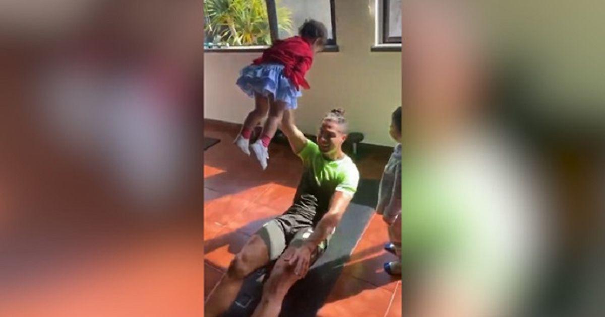 Начнем с главного фаната тренировок. На карантине Криш уже запустил челлендж на самое большое количество скручиваний. А теперь он качает пресс, используя детей вместо гантелей.