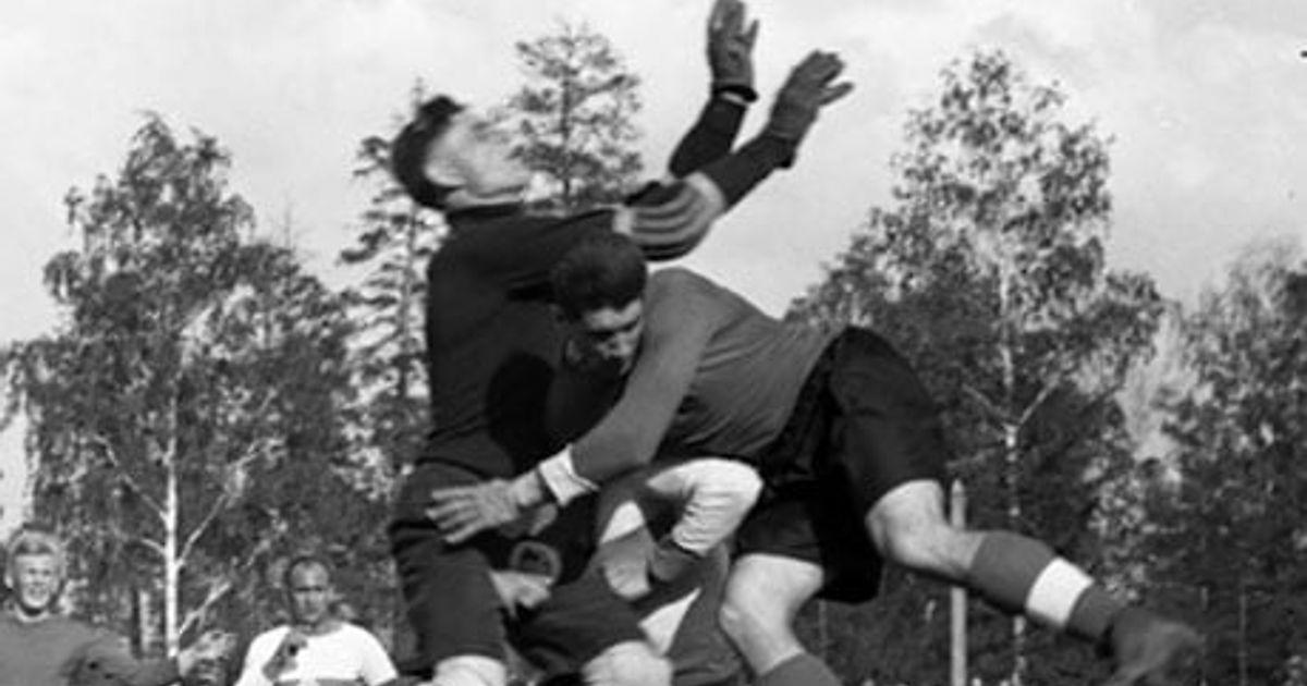Безымянный вратарь (это точно не Анатолий Акимов — он в тот день был в спартаковских воротах) выставляет руки под высокий мяч, форвард «играет в тело», чуть опоздавший защитник едва не попадает в переплет, но успевает укрыться на заднем плане.