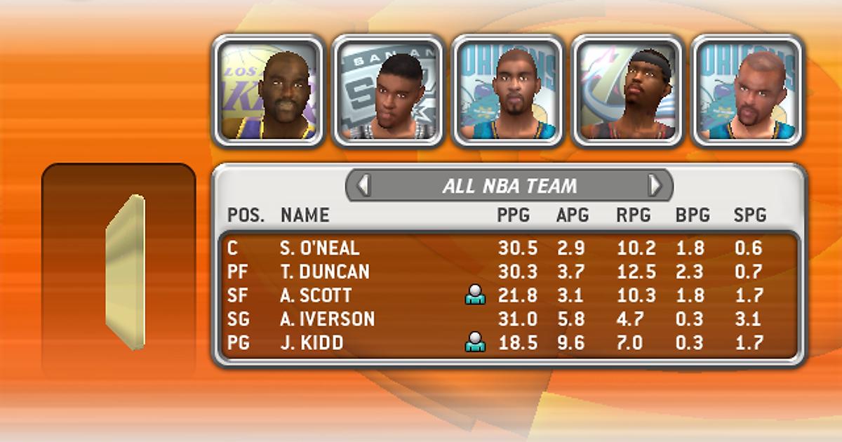 Кидд попал сюда по большей части за первую половину сезона (поскольку игра все считает исключительно по личной статистике – Данкан стал MVP, хотя САС одна из худших команд НБА): когда я его выменивал, он набирал 20,7 очков в среднем. В моей команде, как видите, результативность резко упала, но ее хватило, чтобы опередить Бэрона Дэвиса, Андре Миллера и совсем старого Гэри Пэйтона – не припомню, чтобы кто-то не из этой четверки попадал в первую сборную сезона (второй и третьей в игре не существует, а разделение на АЗ и ПГ – наоборот, существует, в отличие от реальной символической сборной).