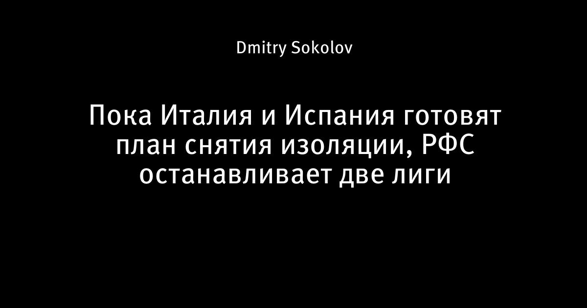 Италия и Испания прорабатывают план снятия карантина. В России наметился позитивный тренд, и Мишустин дал указание проработать поэтапный план снятия карантина. И тут – РФС выступила с заявлением, которое никто не ожидал – завершить вторую и третью лиги. Хотя это прямо противоречит указаниям УЕФА доиграть лиги и решить все вопросы по спортивному принципу. Что это?