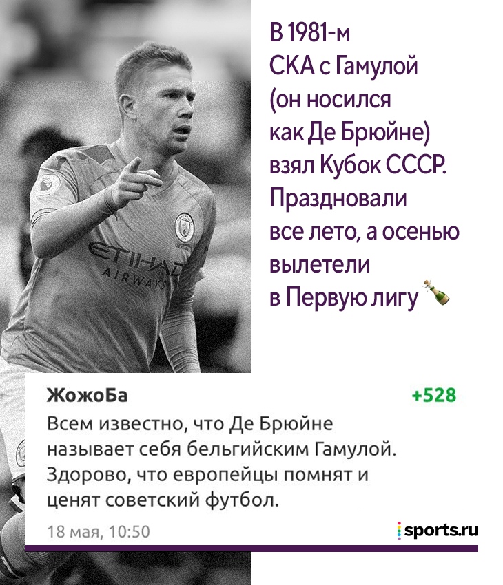 В 1981-м СКА с Гамулой (он носился как Де Брюйне) взял Кубок СССР. Праздновали все лето, а осенью вылетели в Первую лигу 🍾