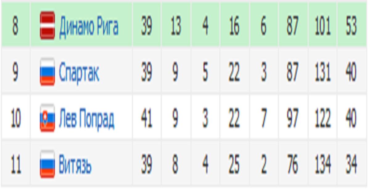 Здесь идёт вообщем-то очень упорная борьба. И точно только Автомобилист и Сибирь потеряли шансы на игру в хоккей весной, а Кузня и Нефтехимик ещё поборятся. Но на данный момент именно эти команды находятся вне зоны плей-офф.