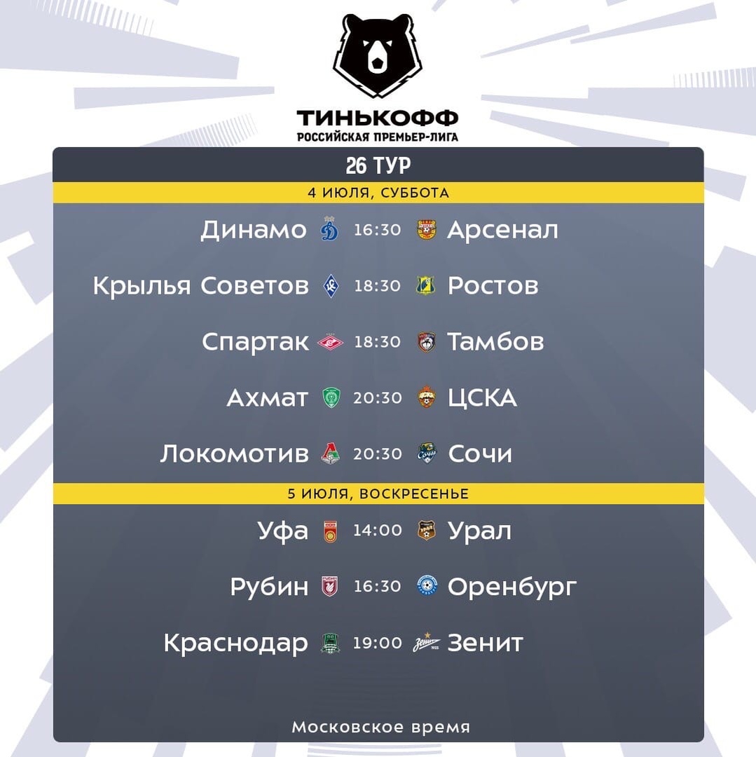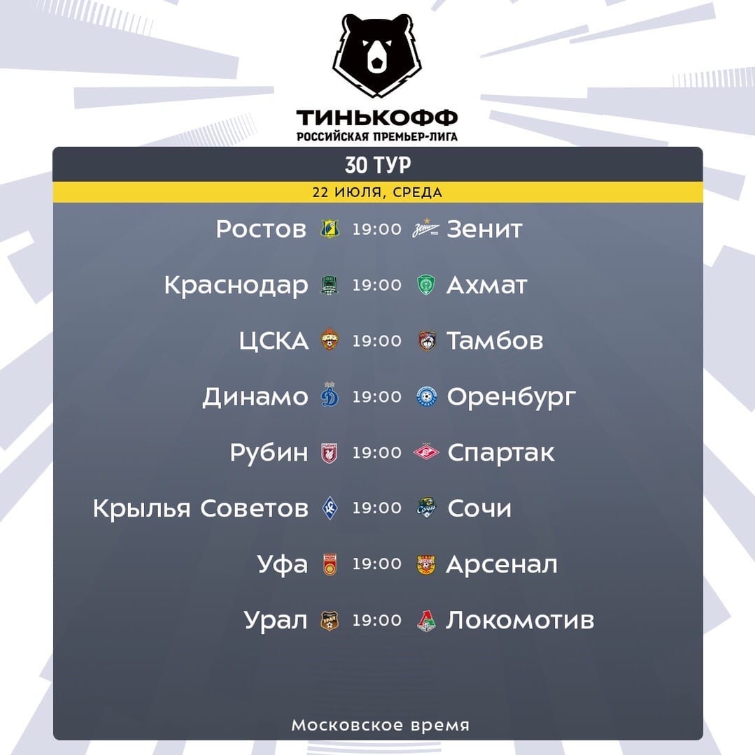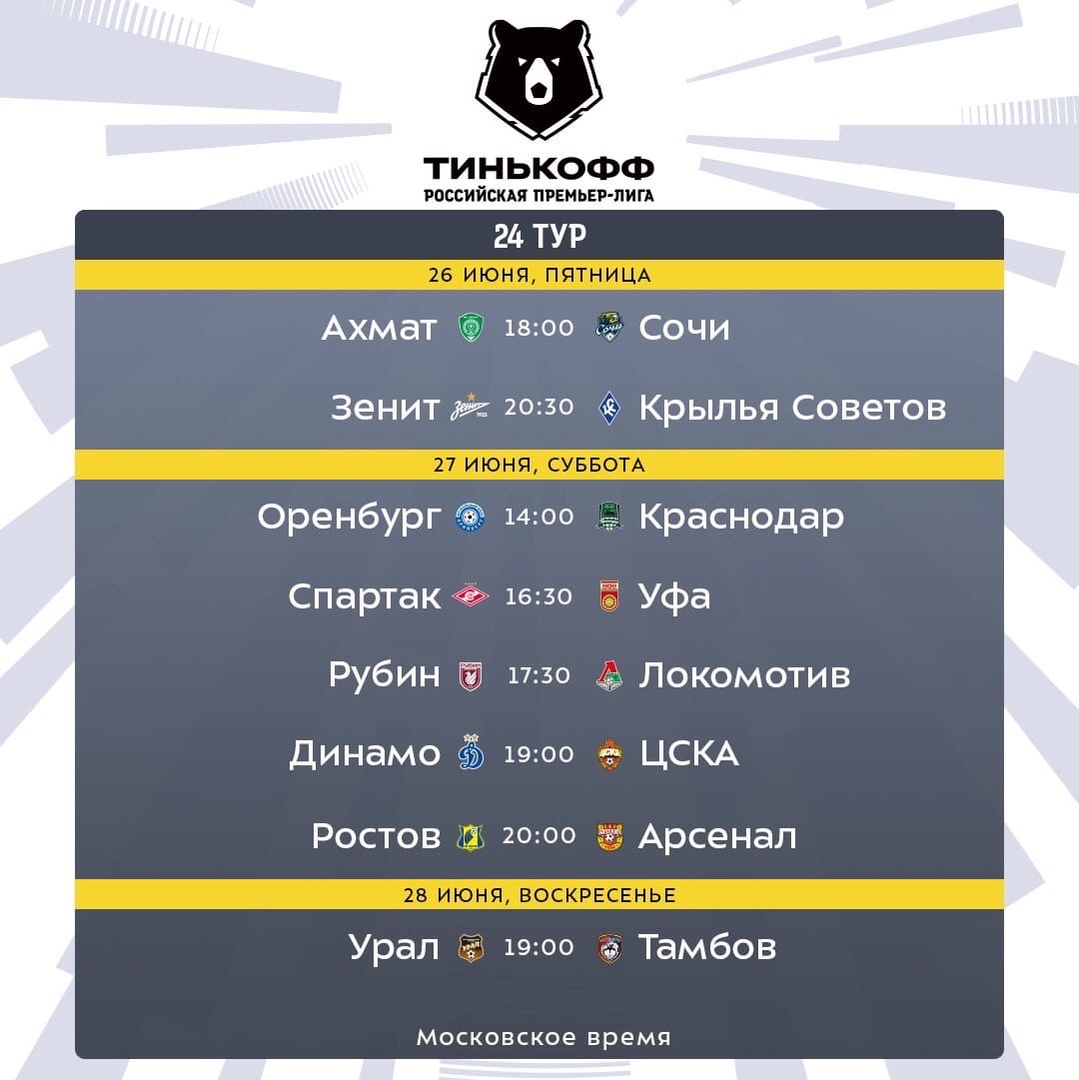 Сезон Тинькофф Российской Премьер-Лиги 2019/20 возобновится 19 июня матчем «Крылья Советов» – «Ахмат». Последний тур состоится 22 июля.