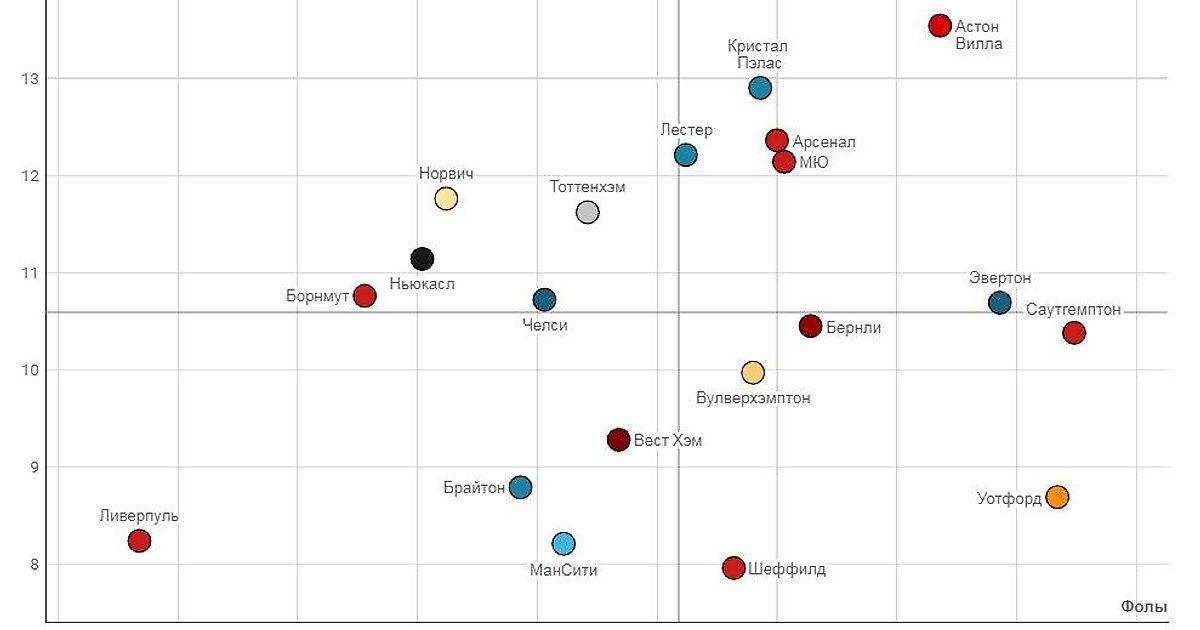Наименее фолящей командой лиги с запасом стал «Ливерпуль» (8,34 фола в среднем за матч).