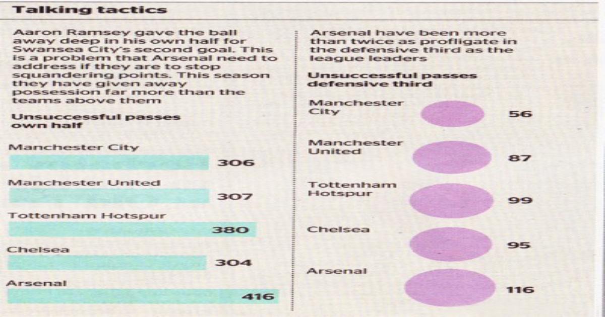 Как мы с вами можем убедиться из нижепредставленной диаграммы, "Арсенал" в этом сезоне значительно чаще своих непосредственных конкурентов ошибается в передачах как на своей половине поля, так и в непосредственной близи у своей штрафной.