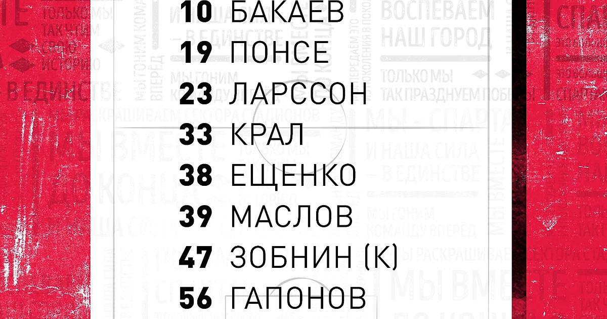 С первых минут сыграют: Максименко, Жиго, Бакаев, Понсе, Ларссон, Крал, Ещенко, Маслов, Зобнин (капитан), Гапонов, Рассказов.