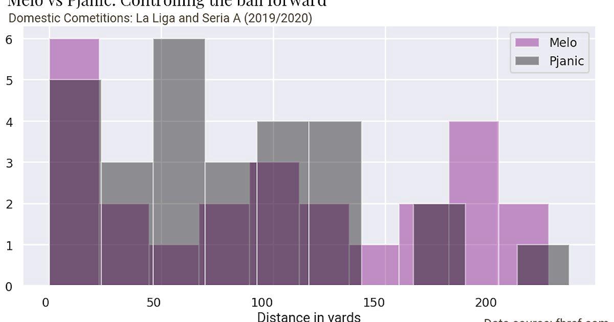 У Миралема показатели как будто бы ниже - в дриблинге он малое количество раз преодолел отметку в 150 ярдов - лишь три игры. Основной его показатель - 50 - 140 ярдов: 5 раз в районе 25 ярдов (как и Артур), 12 раз около 50, 8 раз в районе 100-140. Но в чём же суть? Думаю, здесь основную роль играют два фактора: амплуа и система Сарри. У неаполитанского наставника опорник часто получает мяч и постоянно начинает атаки - это всё предполагает не большое количество дриблинга, а множество передач. Дриблинг перед линией обороны, будучи игроком практически последнего рубежа - огромный риск. Задача Пьянича - найти верное решение для продолжения атакующих маневров. Если опорник попытается взять на себя ношу дриблёра, то его быстро разберут - это же не фланг, где можно реализовывать пространство за счёт дриблинга и скорости. Да, в некоторых ситуациях он уместен, поэтому и количество продвижения с мячом у Пьянича имеется (смотрим в график), но риск должен быть оправданным. Требовать у боснийца преодоления огромных территорий будет неуместно - он делает в районе 100-150 касаний и передач за игру, а это весомый вклад и тяжелая работа, даже фундаментальная. Поэтому всегда можно заметить, что Пьянич быстро расстаётся с мячом за счёт передач, не особо продвигаясь сквозь редуты соперников.