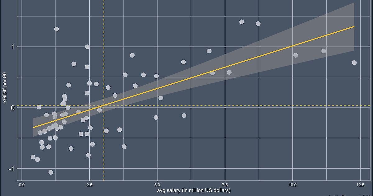 На графике ниже по оси X - срежняя зарплата игрока в миллионах US долларов, по оси Y - "перформанс" команды в этом сезоне, а именно разница между xG per 90 и xGAllowed (допущенные) p90