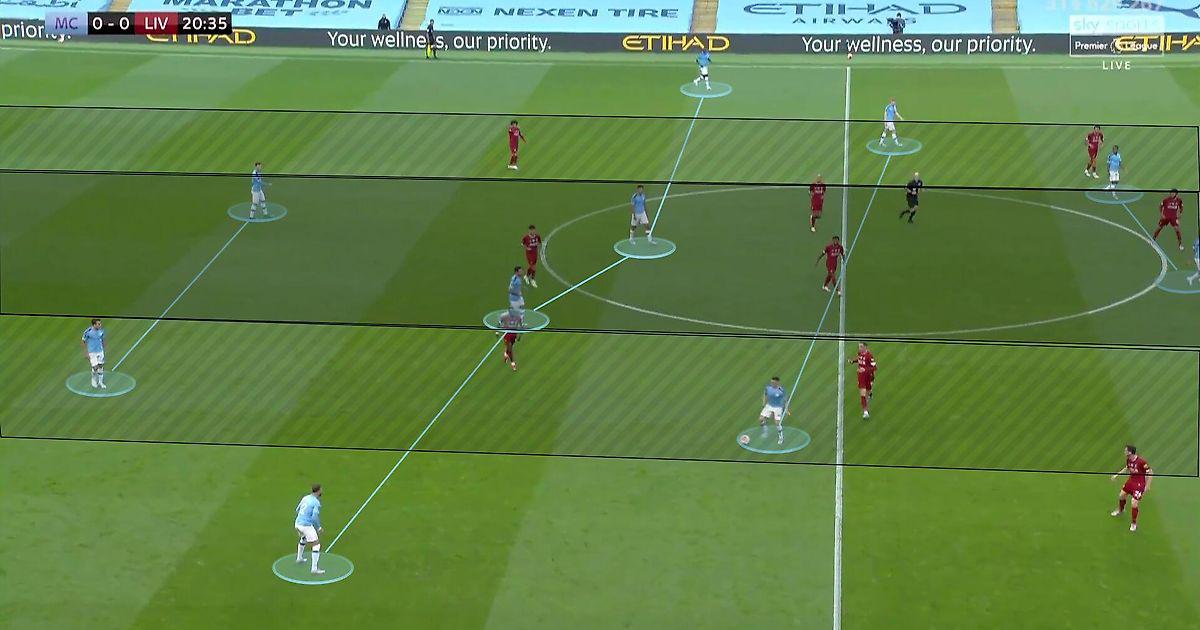 Подобным образом Гвардиола смог искусно обыграть средний блок соперника за счет движения мяча и гибкой схемы, в которой широко расставленные фулбеки и расположенные за спинами полузащитников вингеры создавали трудности для команды Клоппа.