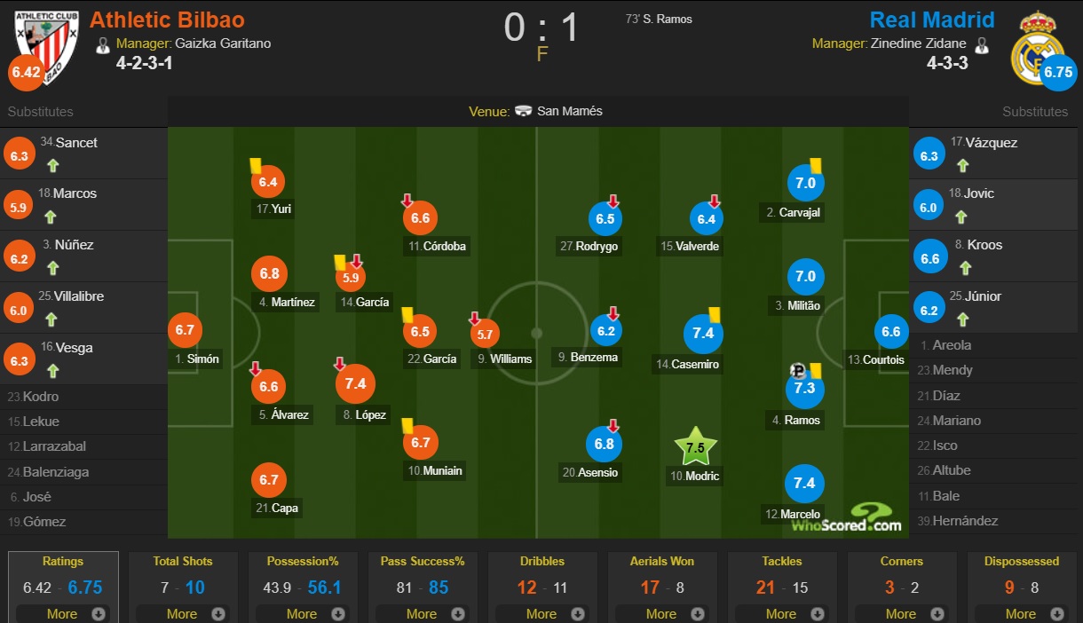 Мадридский «Реал» обыграл «Атлетик» на выезде, благодаря голу Серхио Рамоса. WhoScored представил оценки за матч. Высший балл получил Лука Модрич.