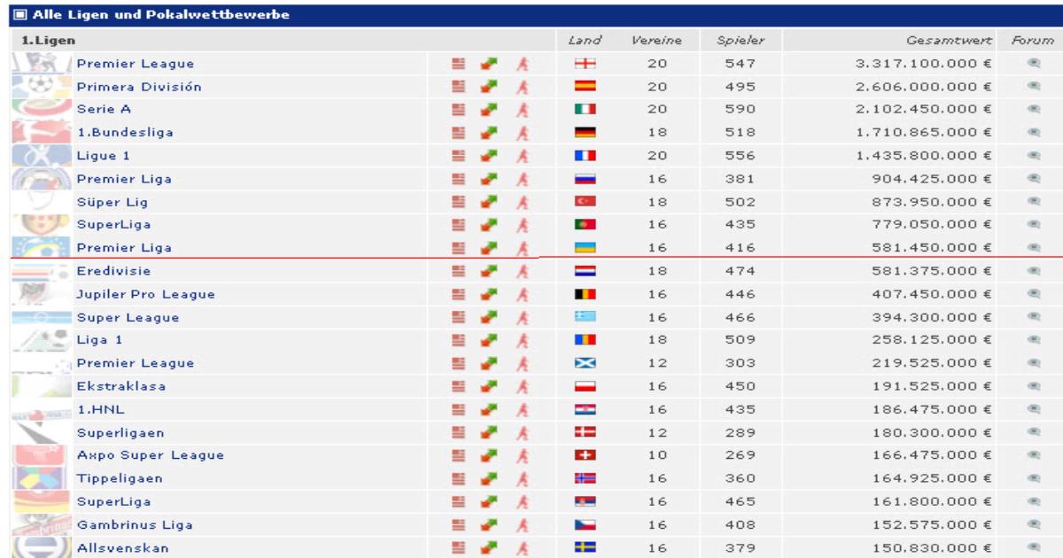 Украинская Премьер-лиге находится на почетном девятом месте, с суммарной стоимостью игроков – 581 450 тыс. евро. Это довольно неплохо для страны, уровень жизни которой оценивается как третий в Европе, правда не с начала, а с конца. Например, в более, чем благополучной Швеции, стоимость выступающих там футболистов практически в четыре раза меньше, чем у нас в стране - 150 млн. евро.