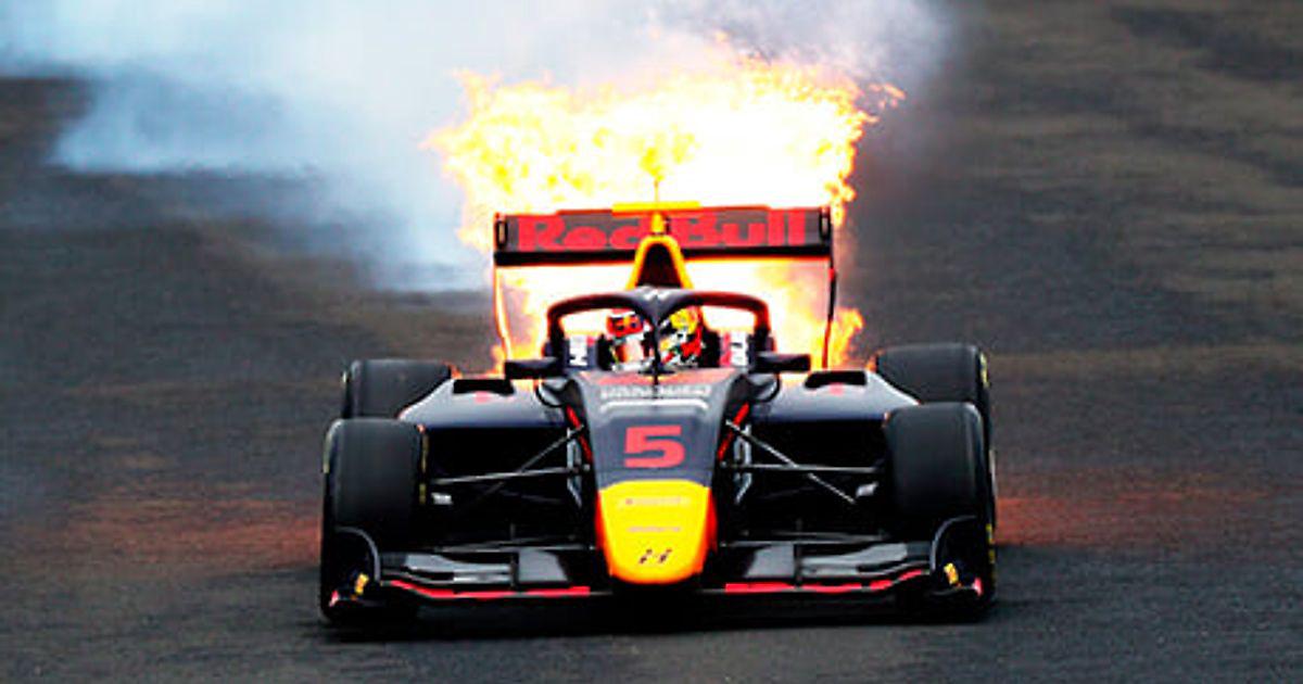 Фееричный пожар в «Формуле-3»: болид пилота «Ред Булл» скосплеил DeLorean из «Назад в будущее»