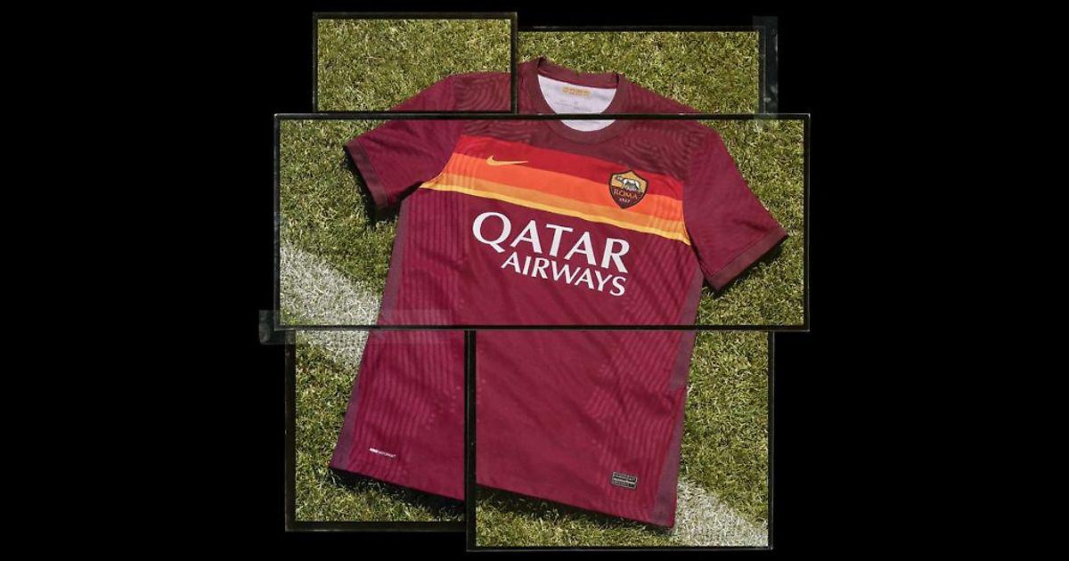 Новая домашняя форма «Ромы» 2020-2021 имеет преимущественно бордовый цвет с желтой, оранжевой и красной полосками на груди и рукавах. Зигзагообразные полосы по бокам окрашены в темно-бордовый цвет. Эмблема титульного спонсора белая.