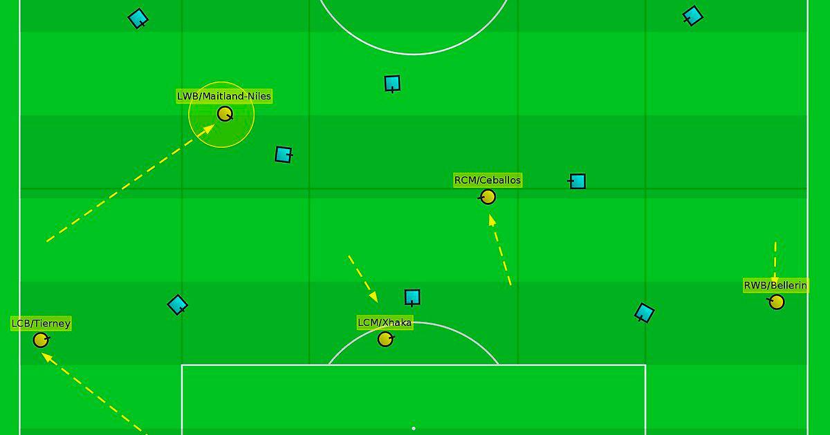 Трех центральных защитников в этом матче играли Тирни, Луиз и Мустафи, крайних - Мэйтлэнд-Наилз и Беллерин. Идея заключалась в том, что при билдапе Тирни смещался на позицию фуллбэка, Джака опускался ниже, а Мэйтлэнд-Наилз заполнял позицию восьмерки.