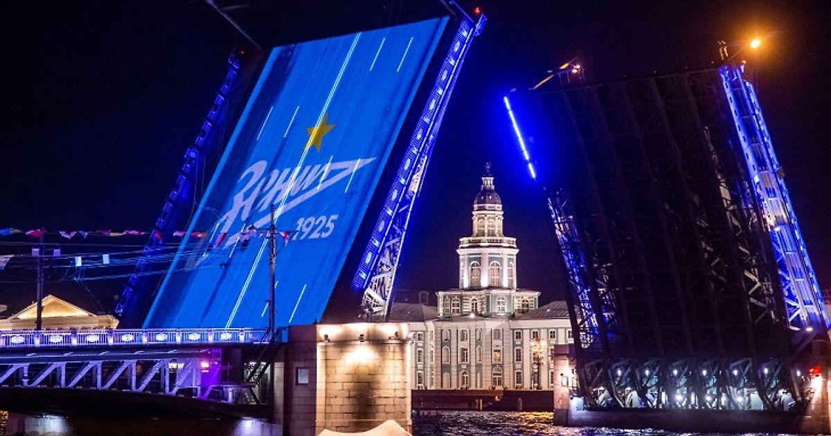 «Зенит» превратил Дворцовый мост в огромный экран (500 кв. м). Показали лучшие моменты сезона