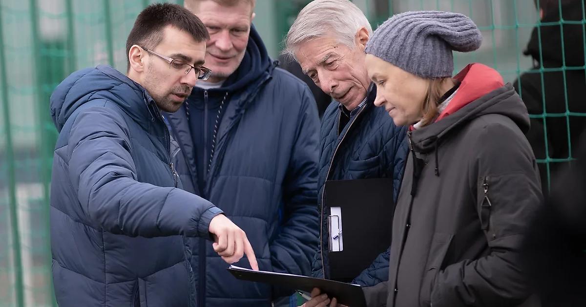 Основатель проекта Алексей Маслов и тренеры Валерий Непомнящий, Александр Подшивалов и Валентина Баркова оценивают футболистов на тестовом запуске проекта.