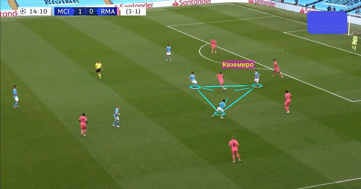 В этом моменте все три полузащитника смещаются по мячу и перекрывают дальнейшее его продвижение. Фоден также заполняет эту зону и привлекает внимание Каземиро: