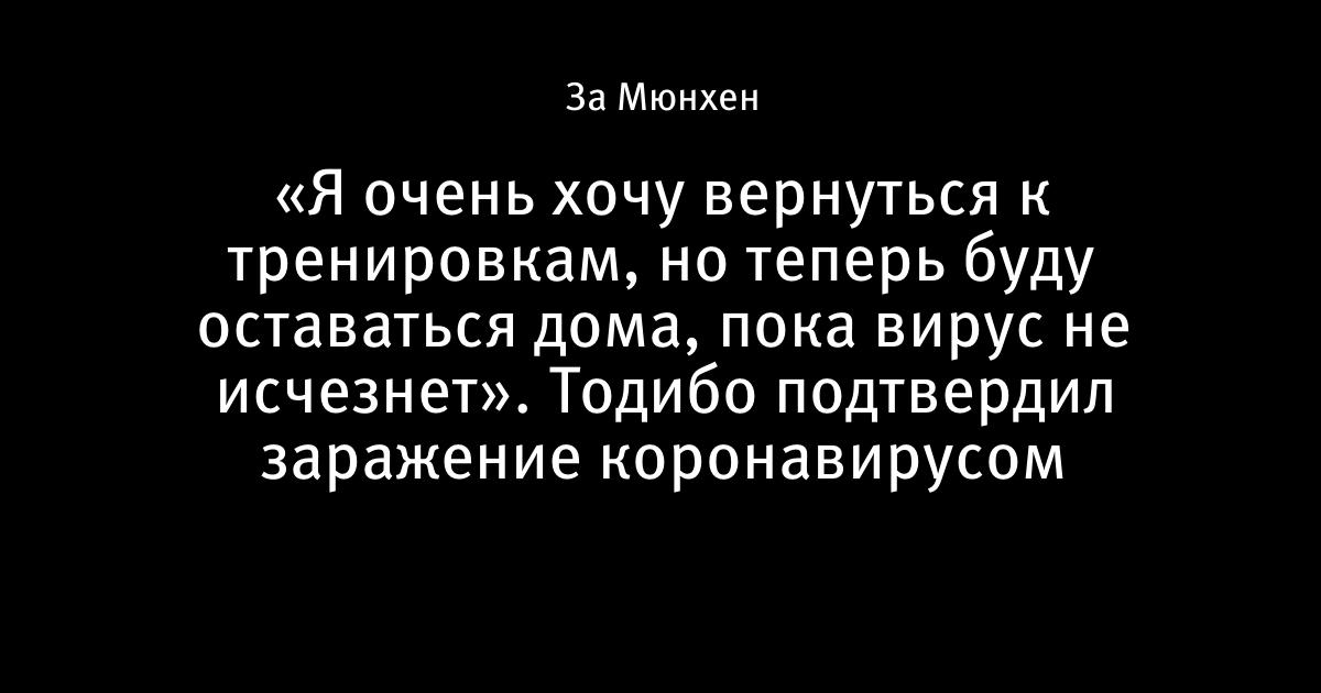 «Всем привет! Сообщаю, что у меня положительный результат на Сovid-19. У меня нет симптомов, и чувствую себя хорошо. Я нахожусь дома, соблюдая протокол. Я очень хочу вернуться к тренировкам, но теперь буду оставаться дома, пока вирус не исчезнет», — написал Тодибо в Твиттере.