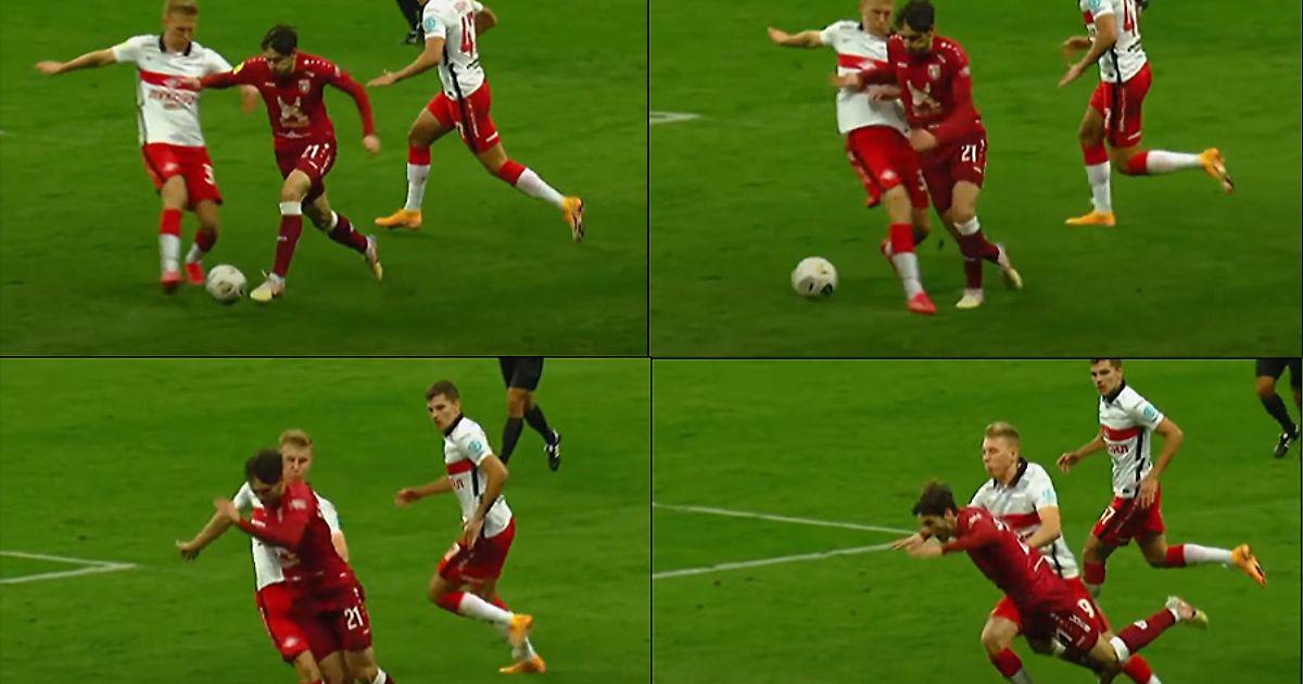 В прошлом туре, был такой же эпизод в матче "ЦСКА - "Спартак". Там Карпов так же, а то и более очевидно снес Айртона. Но Сергей Карасев счел его падение симуляцией. Испугавшись назначить пенальти и удалить игрока "армейцев", к тому же это было на 35' минуте встречи.