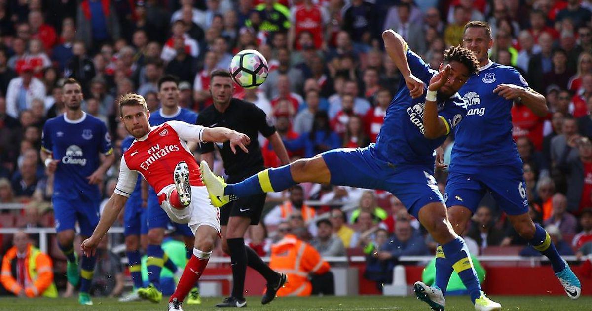 Эмерик ведёт верховую борьбу, но мяч задевает его предплечье