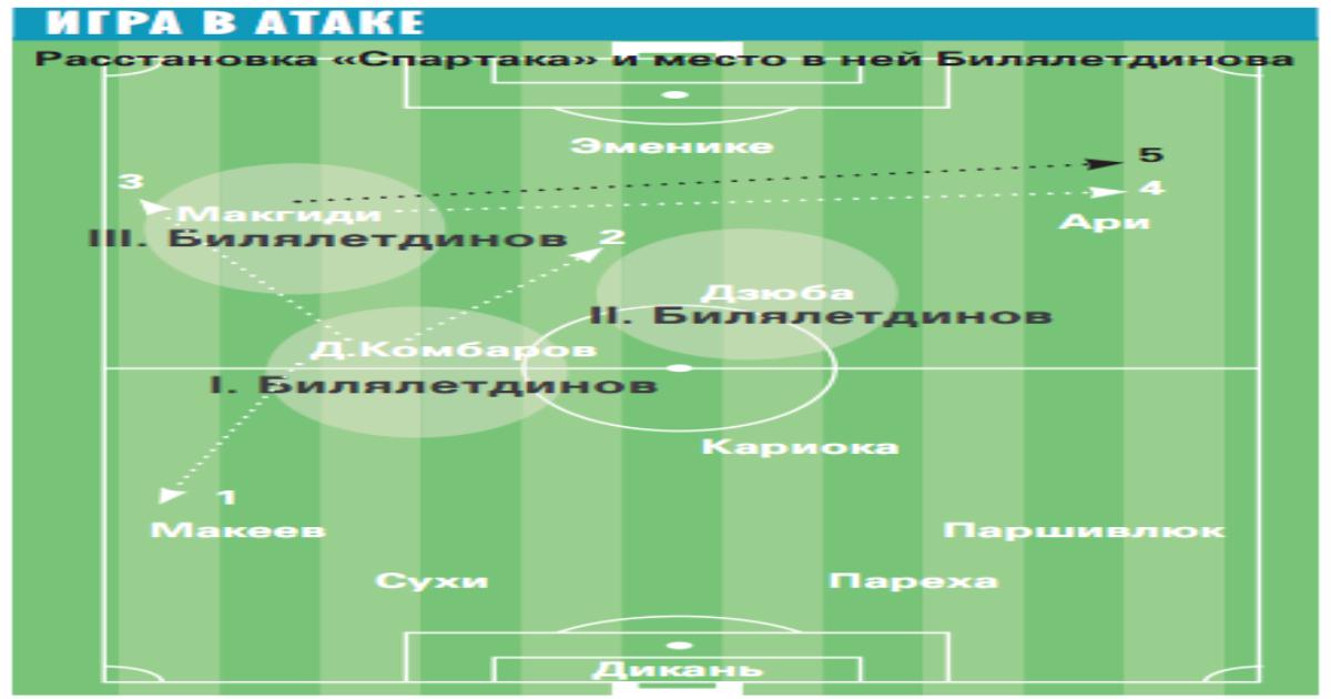 На схеме представлена осенняя модель «Спартака», хорошо зарекомендовавшая себя в отдельных матчах. Билялетдинов, являющийся универсальным игроком, способен сыграть на трех разных позициях – вторым опорником, атакующим и левым полузащитником.