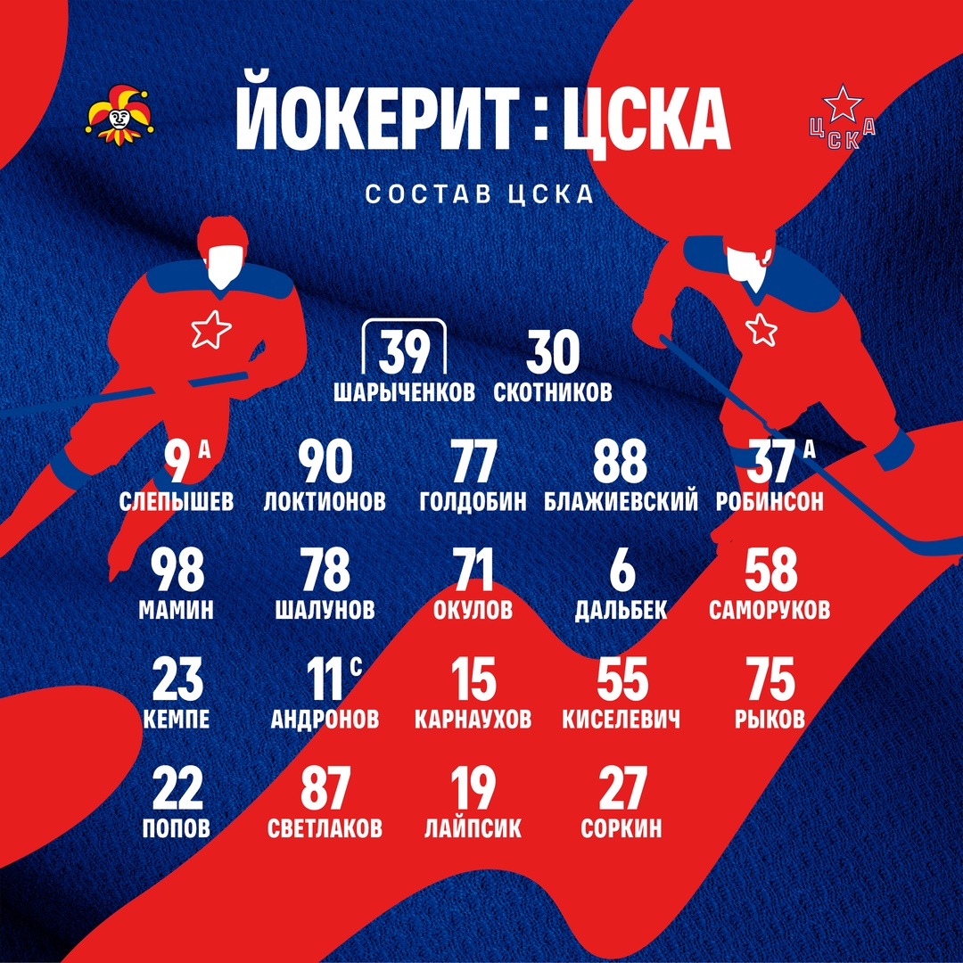 Представляем состав ЦСКА на сегодняшний матч с Йокеритом