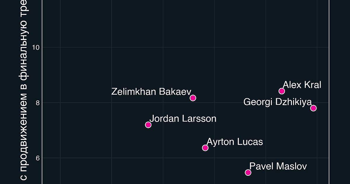 - по оси Y - Количество передач "с продвижением" в финальную треть за матч. Помимо того, что пас должен быть "с продвижения", он должен оканчиваться в финальной трети.