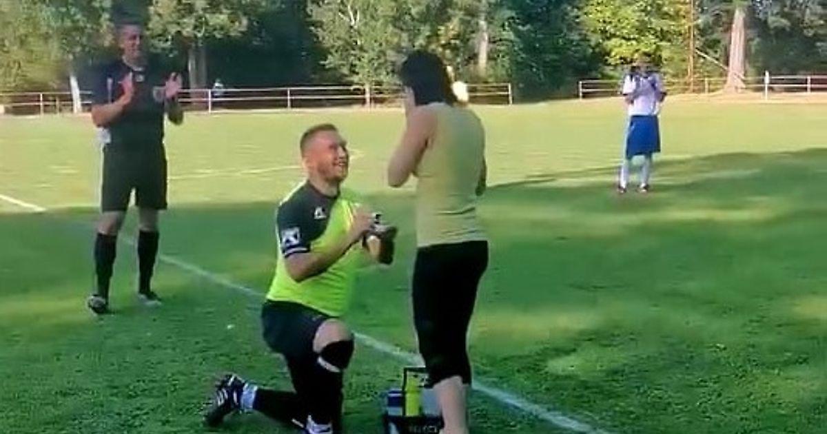 Как только девушка подбежала к травмированному мужчине, он сразу излечился, встал на одно колено и взял кольцо у судьи (ему он предусмотрительно отдал украшение до игры).