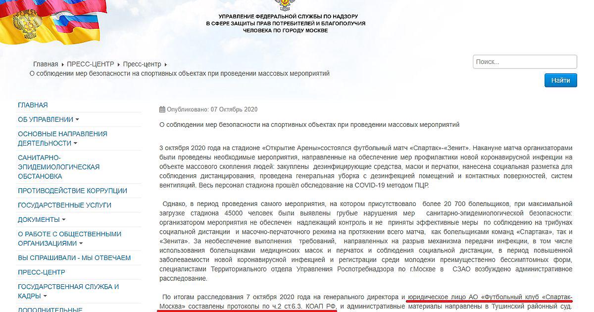 Роспотребнадзор, Спартак и нарушение предписаний (заметка)