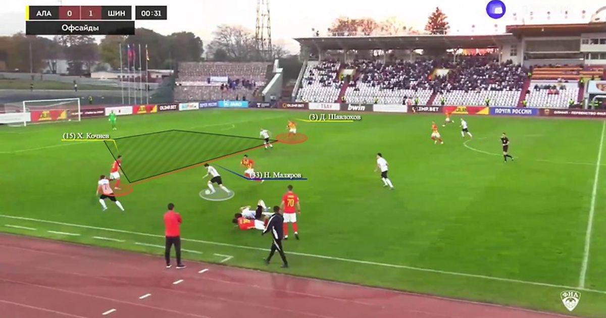 Разрыв между центральными защитниками после потери мяча. Шавлохов пытается сделать искусственный офсайд:
