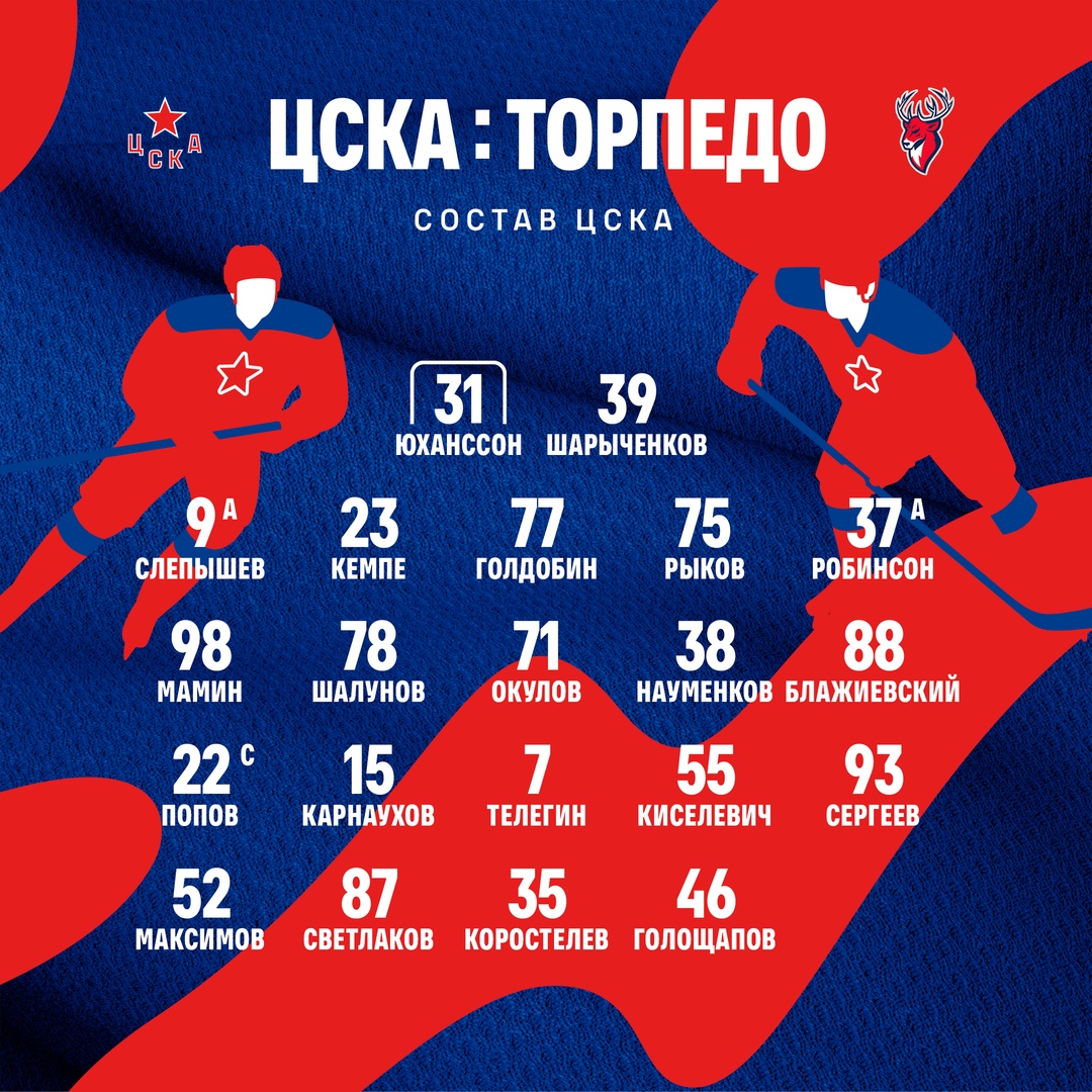 Представляем состав ЦСКА на сегодняшний матч с «Торпедо»