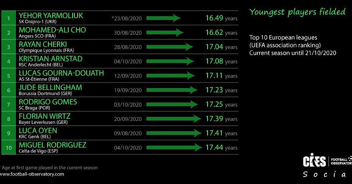 Сразу три игрока из Лиги 1 входят в пятёрку самых молодых футболистов, играющих в этом сезоне в десяти ведущих лигах Европы.