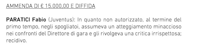 Спортивный директор «Юве» Фабио Паратичи снова оштрафован спортивным судьей. Оказывается, в перерыве матча «Ювентус» – «Верона» Фабио проник у судейскую раздевалку, где критиковал арбитров матча (возможно, эпизод с офсайдом Мораты).