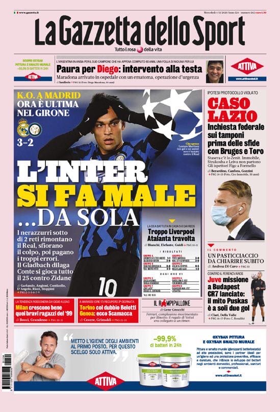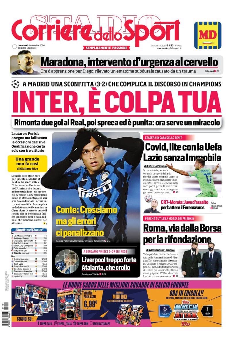 «Интер», это твоя вина. Заголовки Gazzetta, TuttoSport и Corriere за 4 ноября