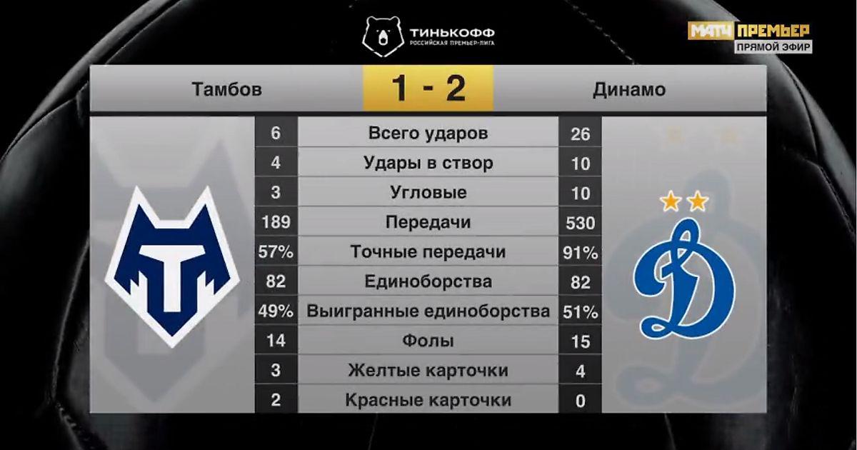 В итоге первый тайм можно охарактеризовать так: Динамо пыталось провести позиционные атаки, но доставить мяч до бьющего получалось в основном за счёт индивидуальной игры и переводов слева направо, а все удары возле штрафной линии не предоставляли какой-либо опасности. Счёт же был в пользу Динамо благодаря ошибке игроков Тамбова, которые особо не горели желанием играть вперёд или чего-то выжидали.
