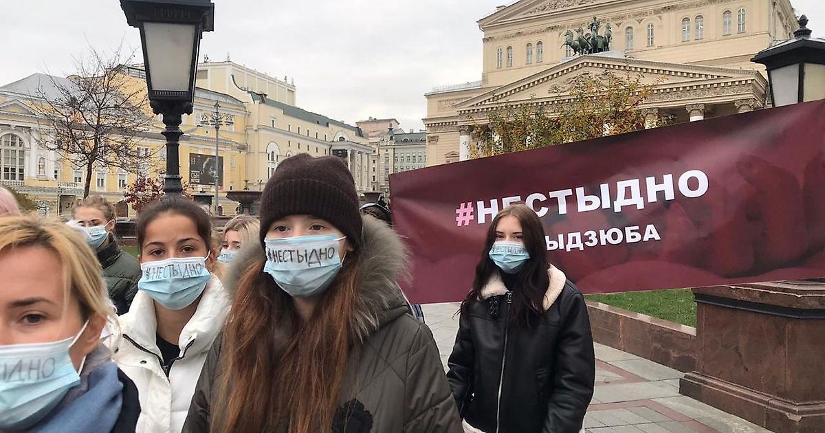 Участие в акции приняли активистки «Первой женской академии». Девушки собрались возле Большого театра с плакатами, на которых было написано #нестыдно и #ямыдзюба.