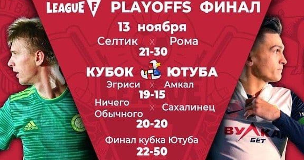 Вот и подходит к концу League F. Мы будем скучать и ждать нового сезона, а пока что Василий Уткин решил устроить нам праздник и организовал кубок Ютуба! «Амкал» pro, «Сахалинец», «Эгриси» и «Ничего Обычного» сыграют выставочные полуфиналы и финал. Расписание сегодняшнего игрового дня на Вернадке вы сможете увидеть ниже: