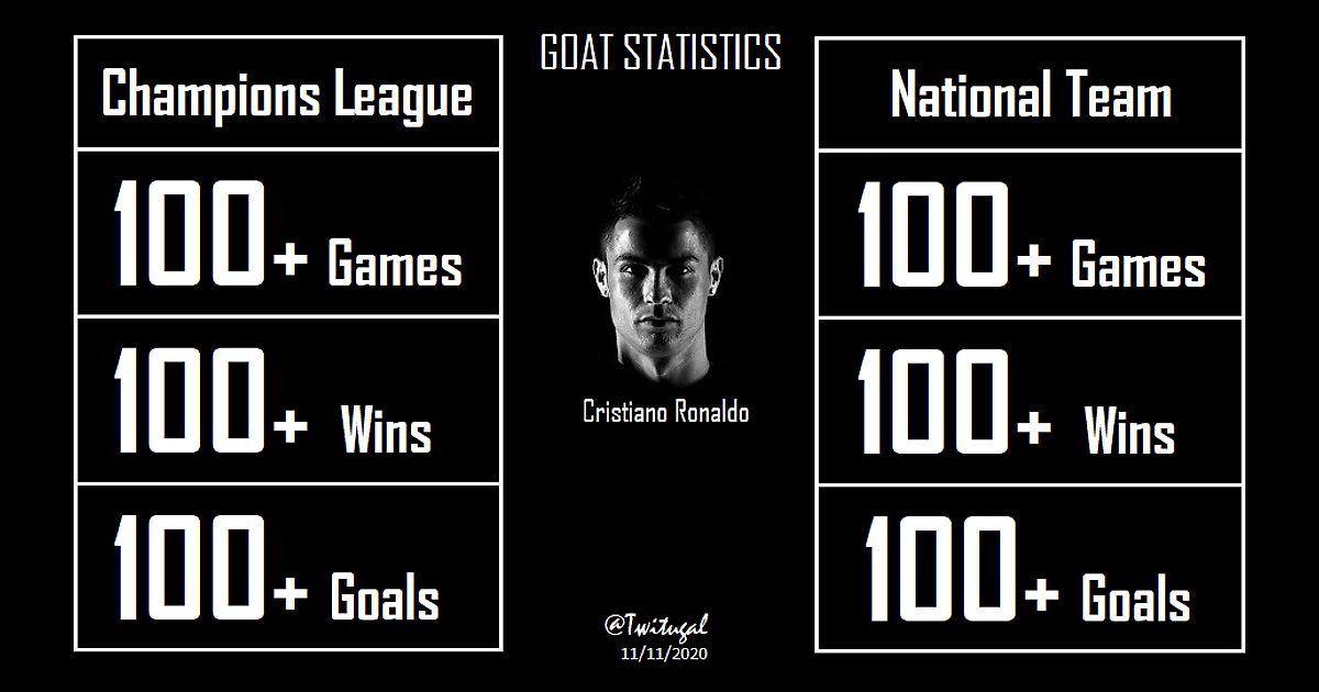 Криштиану Роналду – первый в истории игрок, сыгравший 100+ матчей, достигший 100+ побед и забивший 100+ голов в Лиге чемпионов и за национальную сборную.