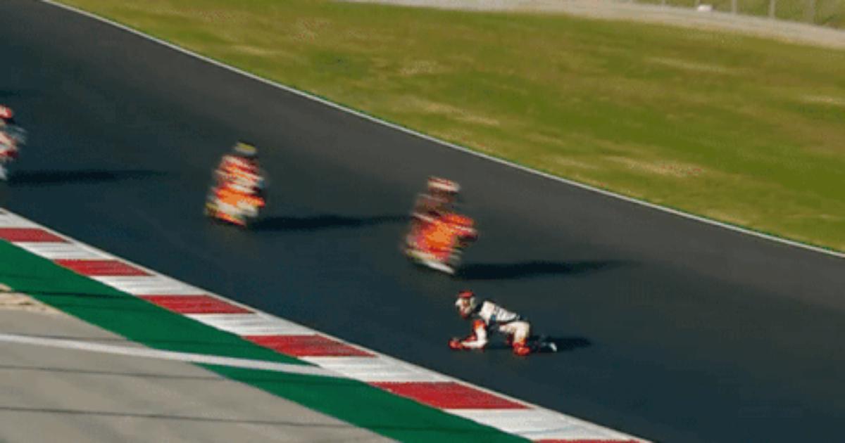 Мотогонщик свалился с байка на трассу прямо перед шестью соперниками. Они чудом пролетели мимо