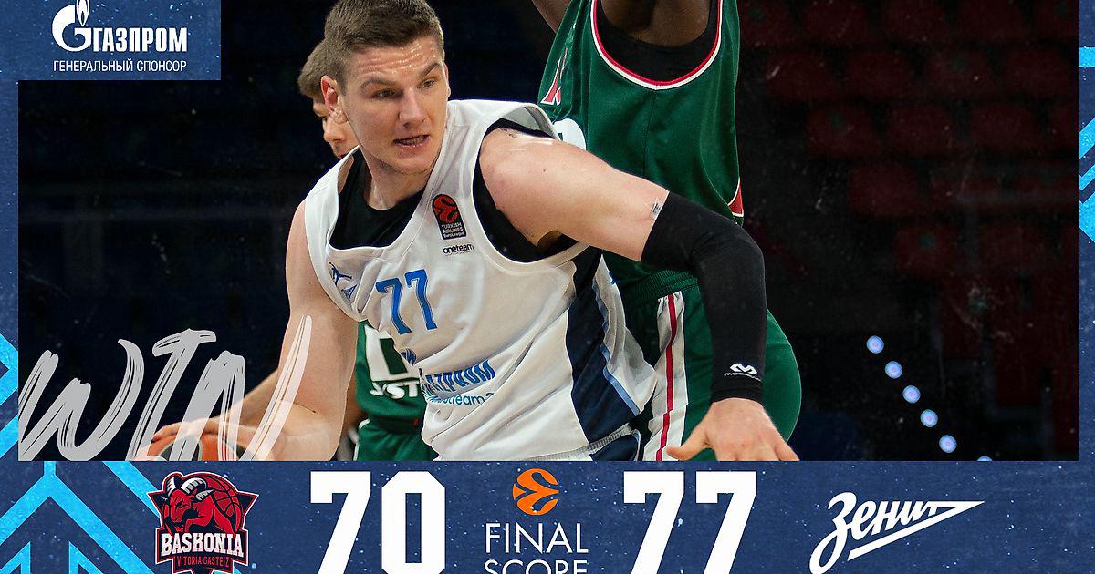 "Баскония" — не та команда, которую можно победить, играя хорошо только в защите. С этим клубом необходимо на протяжении 40 минут выкладываться на максимум в обоих аспектах игры», — такое наставление получили игроки «Зенита» перед матчем от Хавьера Паскуаля. Испанская команда, хоть и располагается на 11-ой строчке с 4 победами и 4 поражениями, но если посмотреть на список клубов, над которыми «Баскония» одержала победы — а это «Реал», «Панатинаикос», «Химки» и «Фенербахче», то становится ясно — в Испании петербуржцам будет непросто. С первых минут матча Душко Иванович выпустил на площадку следующих игроков: Лука Вильдоса, Рокас Гедрайтис, Артур Куруц, Акилле Полонара и Тони Джекири. Хавьер Паскуаль выбрал такую стартовую пятёрку: Пангос, Холлинз, Гудайтис, Томас и Понитка. Больше половины очков «Зенита» в первой четверти приносит Артурас Гудайтис. Он открывает счёт в матче двумя попаданиями со штрафного после фола Акилле Полонара, а затем добавляет к ним ещё два двухочковых. Не только промахиваемся сами — 9 промахов допускаем, но и позволяем бросать соперникам, из-за чего частенько отпускаем «Басконию» на 5 очков вперёд. Правда, стабильно забираем подборы на своём щите — их 9, а всего — 12. Лучший в составе хозяев Юссуфа Фалль, у него 4 очка в стартовой четверти. Завершаем её со счётом 13:10 в пользу испанцев. Отпускает «Зенит» соперников на 7 очков за 2 минуты второй четверти — 17:10 благодаря двухочковым от того же Фалля и Пьеррии Хенри. Появляется в этой десятиминутке на площадке у петербуржцев Виталий Фридзон и сразу же совершает перехват. Догоняем благодаря штрафному от Пангоса, 4 очкам от Пойтресса, включая фирменный данк Алекса и выходим вперёд с помощью трёхи от капитана Матеуша Понитки — 17:18 за 6 минут до конца первой половины матча. «Баскония» восстанавливает +1, но Кевин Пангос из-за дуги делает +2, испанцы сравнивают, но Кевин вновь попадает дальним броском и делает уже +3, а Пойтресс добавляет ещё двушку — 21:26. Трёшки от Гедрайтиса и Драгича и штрафной Луки Вилдосы стали последними очками «Басконии» в этой половине встречи. «Зенит» благодаря двухочоквым Понитки, Пангоса, Фридзона и Барона уходит на перерыв с преимуществом в 6 очков — 28:34. В перерыве Хавьер Паскуаль делает акцент на том, что команде необходимо улучшать игру как в защите, так и в нападении. Но меньше чем за 4 минуты +6 «Зенита» превратились в -4. Сначала трёшка Гедрайтиса, двушка Джекири, его же штрафной после фола Понитки в защите сравняли счёт — 34:34. Затем Гедрайтис наштамповал ещё 5 очков — а их к половине третьей четверти накопилось уже 13, а после двух подряд фолов от Пойтресса и Пангоса на табло уже было 42:38. Эмоциональная речь Паскуаля во время тайм-аута пошла команде на пользу — не только отыграли отставание, но и вышли вперёд — 49:53. Эффектной трёхочковой бомбой Андрей Зубков мог бы подвести итог третьей четверти, но добывает баззером два очка Полонара для «Басконии» — 51:56. Вторая трёшка в матче практически с той же позиции от Андрея Зубкова. Зарабатывает "2+1" Гудайтис и преимущество «Зенита» доходит до 11 очков. Затем Артурас фолит сам и Юссуфа Фаль сокращает до 9, но тут же Гудайтис исправляет ситуацию двухочковым — 53:64. Восьмую результативную передачу записывает на свой счёт Кевин Пангос. Через верхний край щита Понитка делает +13 — 53:66. Бросок со средней от Зубкова и +1