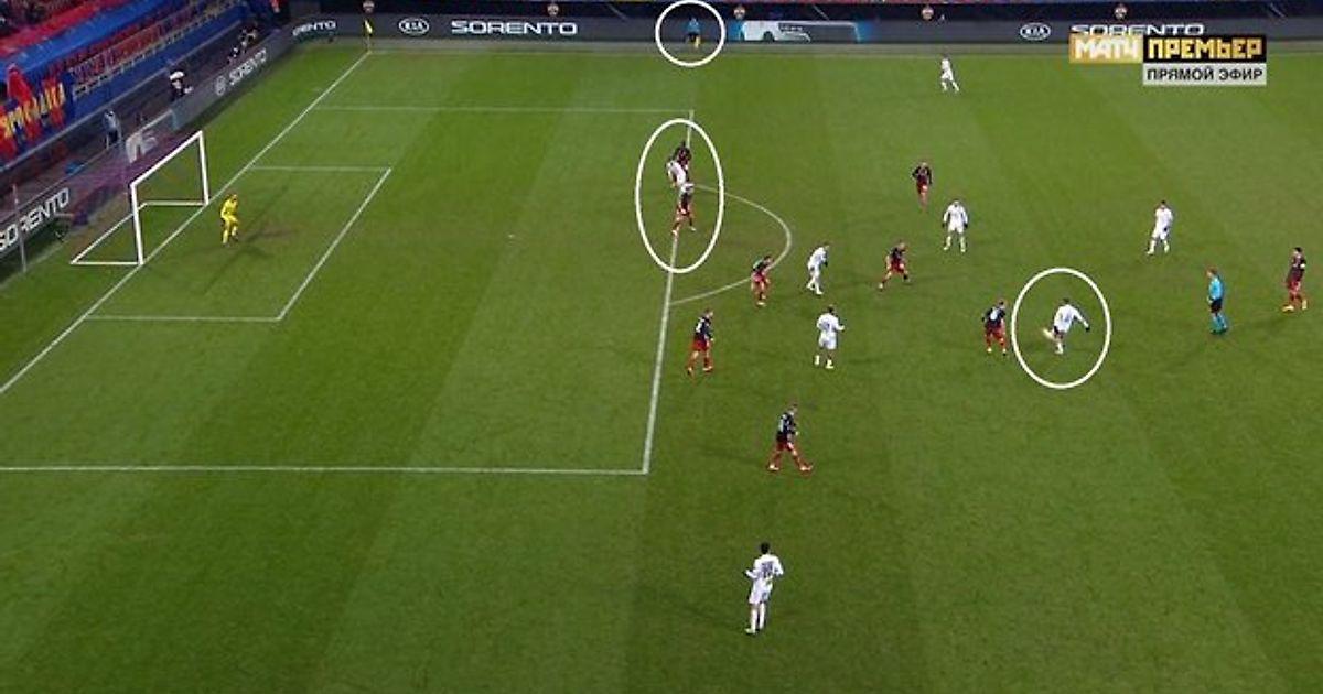 По мнению помощника судьи, игрок ЦСКА оказался в положении «вне игры» в момент передачи Николы Влашича. Решение судейской бригады выглядит как минимум спорным: по видеоповтору нельзя утверждать, что Шкурин забежал за линию офсайда. Скорее всего, его плечо оказалось на одной линии с голеностопом защитника.