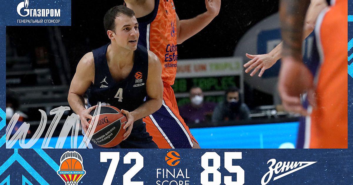 "Валенсия" подошла к матчу с «Зенитом», одержав домашнее поражение от немецкой «Альбы», поэтому мотивации для победы у испанской команды предостаточно. «Валенсия» отлично начала сезон и занимает 5 строчку турнирной таблицы Евролиги. «Зенит» же в гостях в этом евросезоне ещё не проигрывал. Петербуржцы два дня назад одержали победу над УНИКСом в рамках Единой Лиги ВТБ и отправились в Испанию с надеждой сохранить прописку в первой восьмёрке Евролиги на данный момент. Стартовая пятёрка от Жауме Понсарнау выглядит следующим образом: Клемен Препелич, Никола Калинич, Боян Дублевич, Гильем Вивес и Деррек Уильямс. Хавьер Паскуаль в этом матче выпустил на площадку с первых минут Кей Си Риверса. В остальном же состав вполне привычный - Пангос, Холлинз, Томас и Гудайтис. Уже на 20-й секунде матча открывает счёт Гильем Вивес. «Зенит» же, как и говорил Паскуаль перед матчем, особое внимание в этой игре уделяет защите. К первой половине четверти при счёте 4:4 вперёд петербуржцев выводит бывший игрок «Валенсии» Уилл Томас. К его шикарной «трёхе» не менее классный бросок из-за дуги добавляет Остин Холлинз. По сути, именно Уилл Томас и Остин Холлинз — главные творцы счёта на табло в первой четверти — у обоих по 5 очков. Ещё 4 набрал Артурас Гудайтис, атакуя корзину соперников из-под кольца. 12:16 — так заканчиваем стартовую десятиминутку. Ни одного подбора не отдала нам «Валенсия» на своём щите, а сама в нападении взяла 6. 3 заброшенных трёхочковых из 13, по-прежнему ни одного подбора на чужом щите, всего четыре подбора на своём и, к тому же, ни одного штрафного броска. Пожалуй, главные цифры второй четверти и всей первой половины матча. От того и счёт — 39:33 в пользу хозяев выглядит логично. Если говорить о персоналиях, то Кевин Пангос записал на свой счёт уже 6 ассистов, а Алекс Пойтресс, Остин Холлинз и Артурас Гудайтис набрали по 8, 7 и 6 очков, соответственно. Совсем не удавалось «Зениту» справляться с Бояном Дублевичем, который набрал 13 очков, 12 из которых благодаря «двушкам». Как сказал Артурас Гудайтис в перерыве на флеш-интервью — команде не хватает коммуникации в защите, а Хавьер Паскуаль пожаловался на отсутствие концентрации в защите. После экспрессивной речи главного тренера в раздевалке, за первые две минуты третьей четверти Холлинз — броском из-за дуги и двухочковым, а Пойтресс «двушкой» не просто догоняют «Валенсию», а выходят вперёд — 39:40. После каждого заброшенного мяча весь тренерский штаб «Зенита» гнал команду на свою половину площадки, напоминая о защите. 21 очко позволили петербуржцы набрать хозяевам. Вновь пять за Дублевичем, а в сумме 18, а 8 набрал Вивес. «Зенит» же записал на свой счёт 32 очка! Если за первую половину матча Пангос сделал 6 результативных передач, то только за третью четверть Кевин отдал 5 ассистов! А ещё записал на свой счёт «трёху», двухочковый и штрафной. 10 очков набрал Остин Холлинз — 60:65 перед заключительной десятиминуткой. После фола Андрея Зубкова приближает Деррик Уильямс «Валенсию» двумя точными штрафными — 62:65. Однако удерживаем преимущество благодаря «двушке» от Риверс, а затем всё тот же Кей Си Риверс забирает подбор на своём щите, бежит в атаку и забрасывает трёхочковый, делая преимущество «Зенита» +8 — 62:70. Андрей Зубков броском со средней и Матеуш Понитка из-за дуги добирают до 75 очков, в то время как Сан-Эметерио