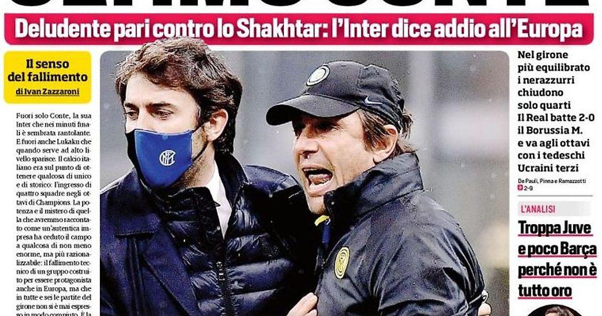 Вылет «Интера» из еврокубков после ничьей с «Шахтёром», новый проход «Аталанты» в 1/8-финала после победы над «Аяксом», а также сегодняшние матчи «Милана», «Наполи» и «Ромы» в Лиге Европы – в утреннем обзоре заголовков итальянских спортивных изданий в блоге «В гостях у Кальчо».