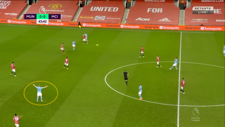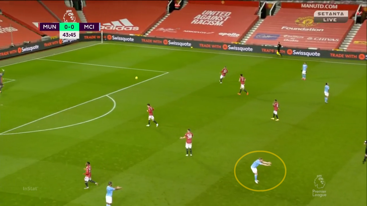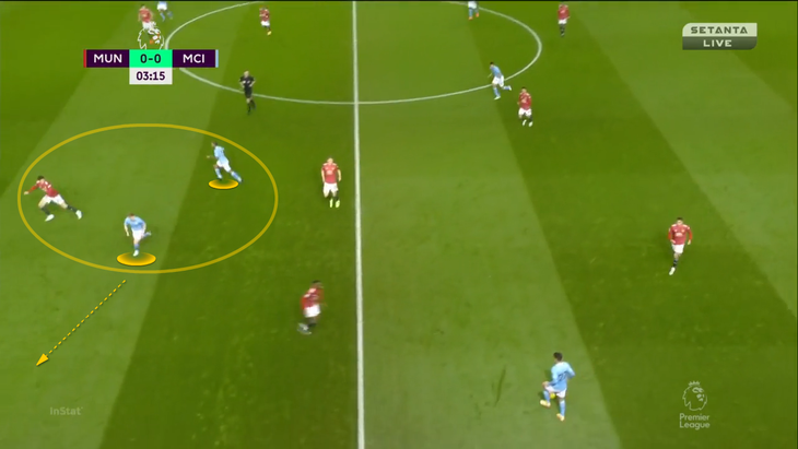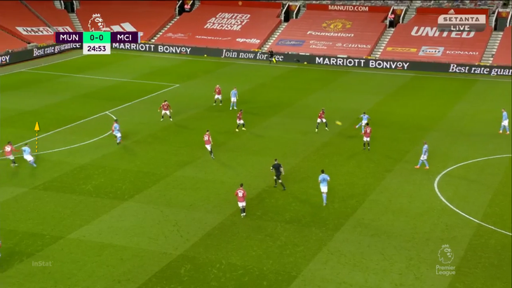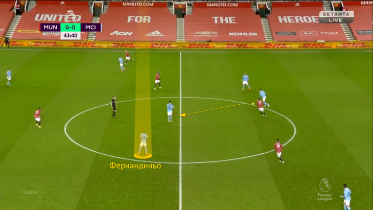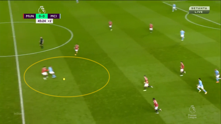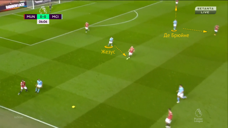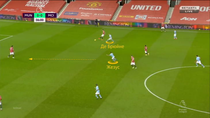 Из-за выдвижения КДБ Магуайру приходится пасовать обратно Линделефу. В этот момент включается Жезус – бразилец перекрывает линию паса на Мактоминея и двигается к защитнику:
