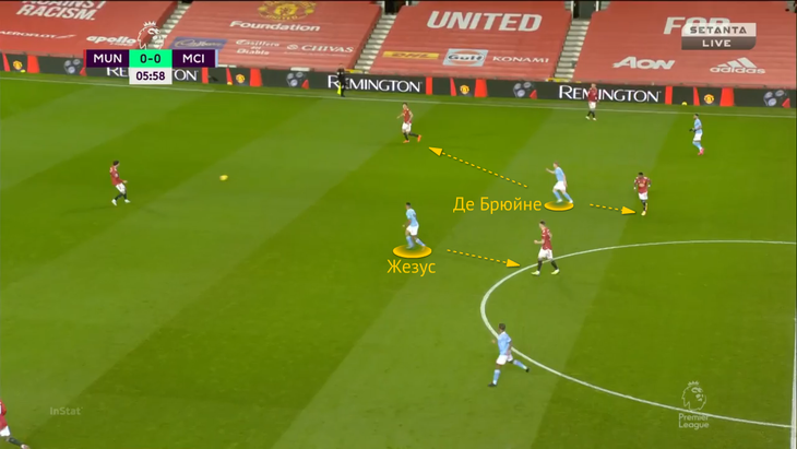 Им приходилось вдвоем перекрывать четверку «Юнайтед» – пару защитников (Линделеф + Магуайр) и пару опорников (Фред + Мактоминей). Неблагодарная роль (хотя бы из-за преимущества «МЮ» в двух игроков), но очень важная – по всей видимости, Гвардиола не хотел привлекать в прессинг больше футболистов, чтобы лучше сдерживать контратаки «Юнайтед». Жезус и КДБ во многих эпизодах справлялись – отчасти благодаря чтению эпизодов и интенсивности. Они стали лучшими в команде по перехватам (у Кевина – 3 штуки, у Габи – 5).