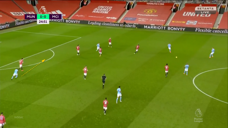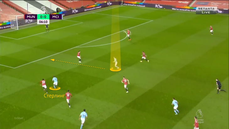 Движение Де Брюйне по цепочке создает разрыв между Линделефом и Магуайром. Туда врывается уже Стерлинг. Магуайр уходит за ним: