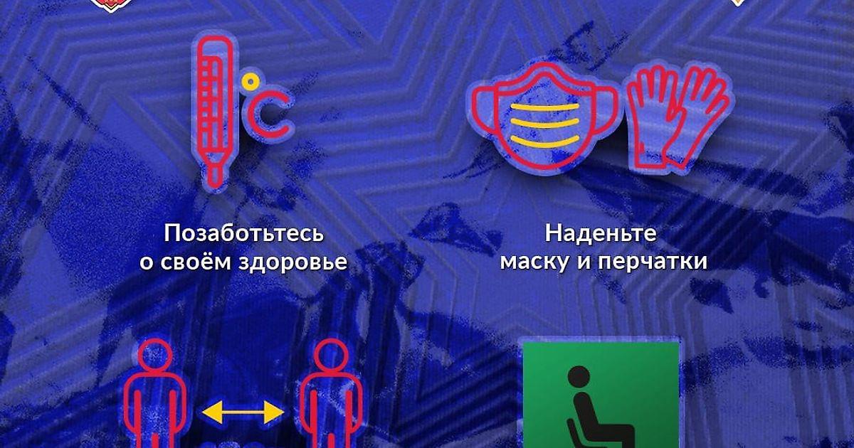 Дорогие болельщики, напоминаем, что для ограничения распространения коронавирусной инфекции, а также во избежание наложения штрафов и санкций на клуб, мы настоятельно просим вас соблюдать простые правила посещения стадиона во время сегодняшнего матча ЦСКА - Урал: