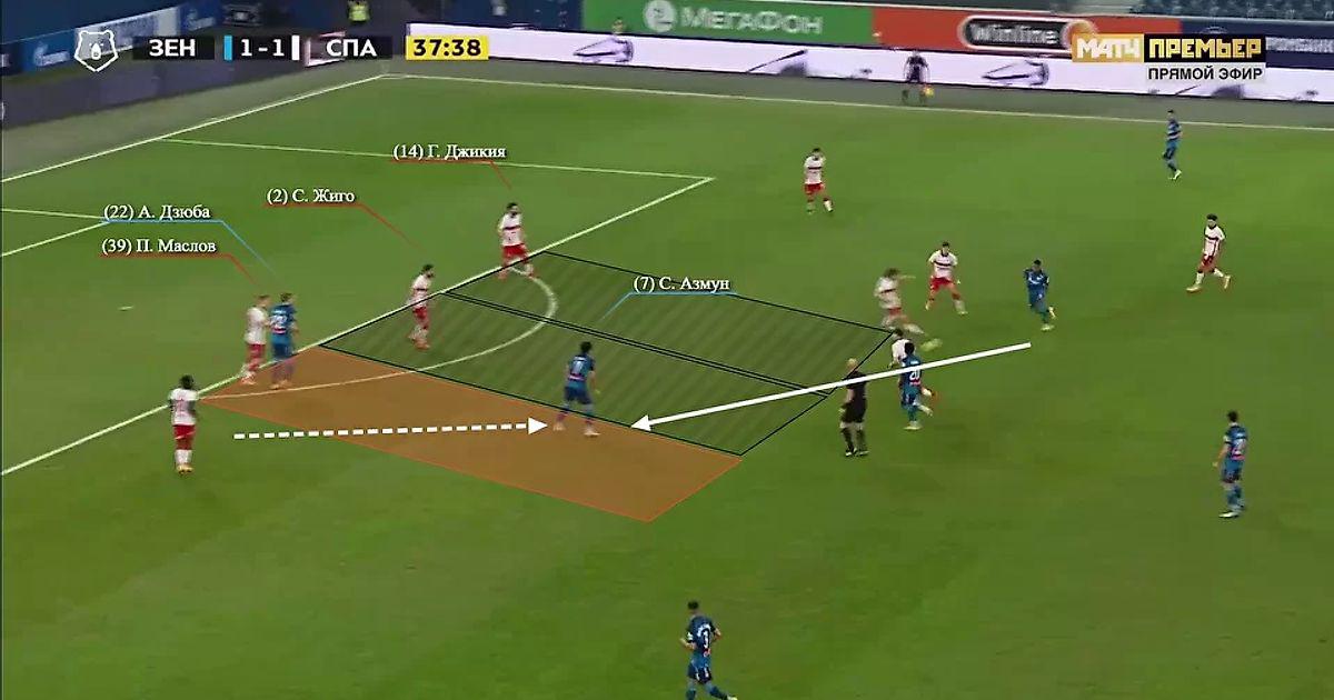 Гости создавали ромбы на флангах и за счет серии коротких передач пытались преодолеть давление. Однако, учитывая то, что в прошлом дерби «Спартаку» удалось сравнять счет после аналогичного взаимодействия, в этом матче «Зенит» перекрыл все подступы. В результате передачи вдоль бровки были чаще всего направлены в никуда.