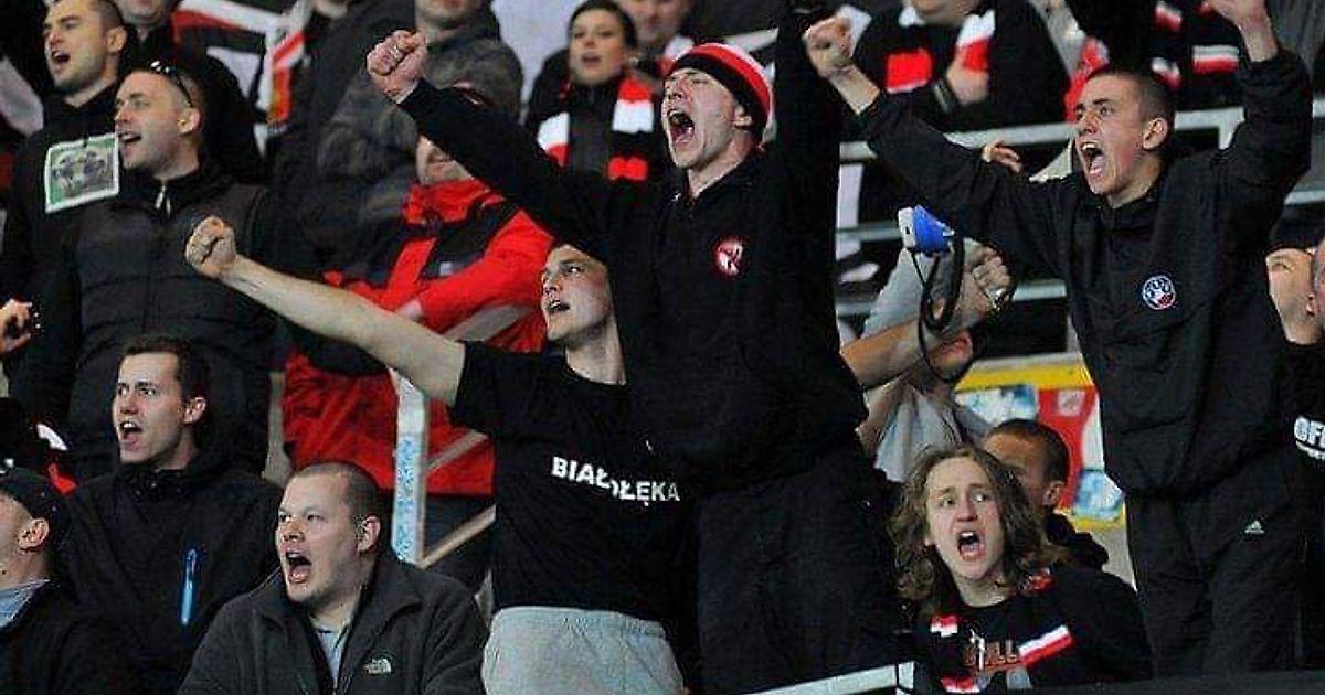 Небольшая справка: С 90-х годов в рядах "Полонии" небольшая часть фанатов придерживалась левых взглядов, пока лет 7 назад правые парни их всё-таки не прогнали с трибуны прямо во время дерби – тогда заварушка началась с того, что антифа пытались снять флаг с перечеркнутым серпом и молотом с вышки капо.